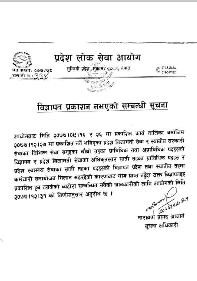 काठमाडौँ । लुम्बिनी प्रदेश लोक सेवा आयोगले वार्षिक कार्य तालिका अनुसार विज्ञापन नखुल्ने जानकारी गराउँदै कारण समेत स्पष्ट पारेको छ । आयोगले मङ्गलवार सूचना जारी गर्दै प्रदेश तथा स्थानीय तहमा कर्मचारी समायोजन मिलान भइरहेकोले नयाँ विज्ञापन नगरिएको जानकारी दिएको छ ।