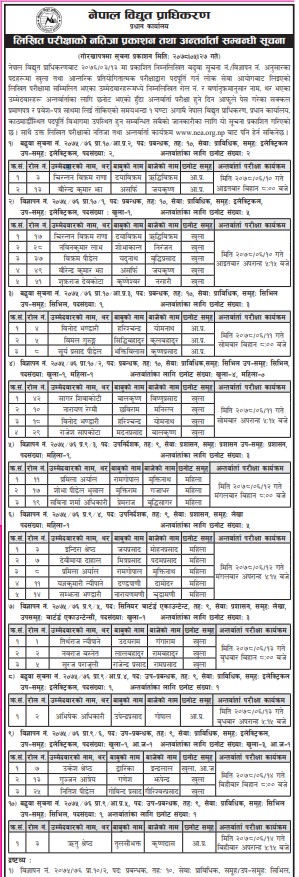 काठमाडौँ । नेपाल विद्युत प्राधिकरणले असार १३ गते प्रकाशित गरेका विभिन्न पदका लागि लोकसेवा आयोगबाट लिइएको लिखित परीक्षाको नतिजा प्रकाशन भएको छ ।