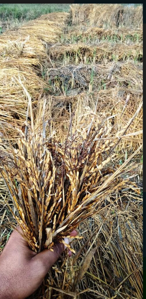 लालझाडी गाउँपालिकाको बल्मीकास्थित खेतमा काटेर सुकाइएको अवस्थामा पानीले भिजेर उम्रेको धान । निरन्तर परेको पानीले काटेको धान भिजेपछि किसानले ठूलो नोक्सानी व्यहोर्नु परेको छ । तस्बिरः राजेन्द्रप्रसाद पनेरु-रासस