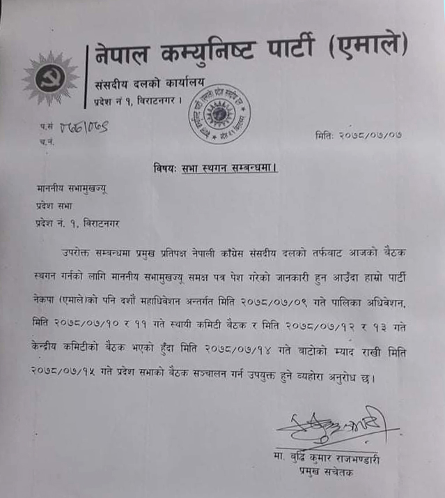त्यस्तै नेकपा एमालेले विभिन्न मितिमा रहेको स्थानीय तह अधिवेशन, स्थायी कमिटी र केन्द्रीय कमिटी बैठक रहेकाले १५ कात्तिकसम्मका लागि सभा बैठक रोक्नका लागि लिखित पत्र पेश गरेको छ।