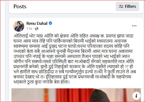रेनु दाहालले आफ्नो सामाजिक सञ्जाल ह्याण्डल मार्फत ‘इतिहासमा दुई पटक प्रधानमन्त्री माओवादी कै सहयोगमा भएकाले ठुला कुरा नगरेकै बेस होला’, भनेर भनेकी हुन् ।