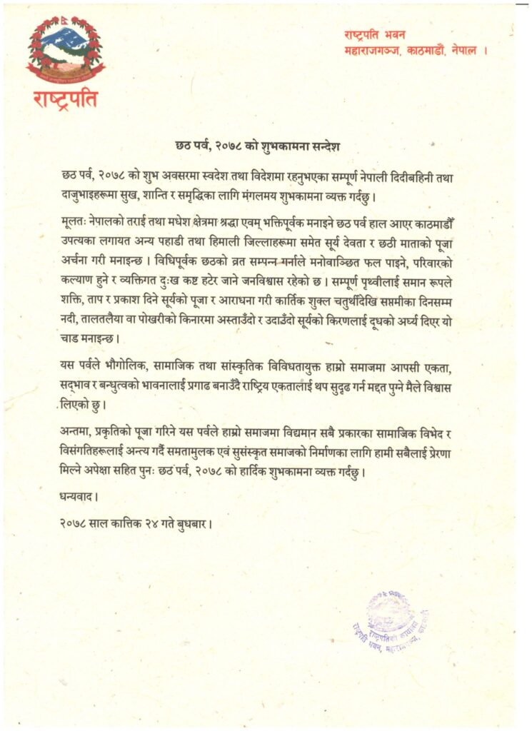 काठमाडौँ-राष्ट्रपति विद्यादेवी भण्डारीले छठ पर्वका अवसरमा स्वदेश तथा विदेशमा रहेका सम्पूर्ण नेपाली दिदीबहिनी तथा दाजुभाइमा सुख, शान्ति र समृद्धिको शुभकामना व्यक्त गरेकी छिन् ।