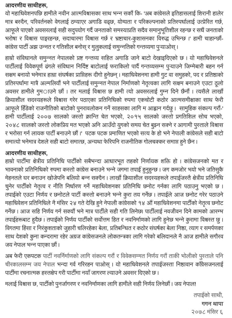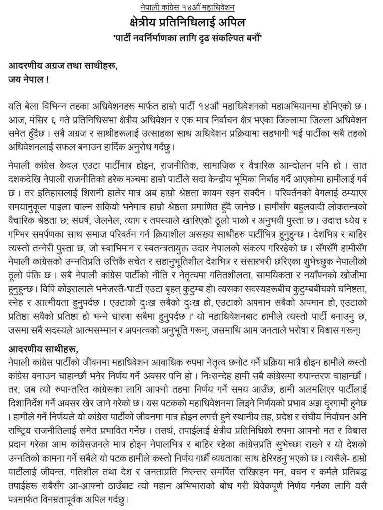 थापाले सोमबार एक अपिल मार्फत कांग्रेसजनको मत र भावनाको प्रतिनिधिको रुपमा कस्तो कांग्रेस बनाउने भन्ने जगमा तपाई हुनुहुन्छ भन्दै क्षेत्रीय प्रतिनिधिलाई सुसुचित गराएका छन् ।