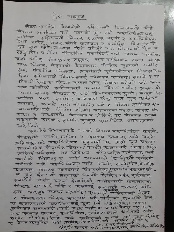 एमाले अध्यक्षमा केपी शर्मा ओली नेतृत्वमा आएपछि दक्षिणपन्थी चिन्तन बढ्नुका साथै नवौं महाधिवेशनबाट पारित विचार, नीति, कार्यक्रम र कार्यदिशा विपरीत रहन गएको विज्ञप्तिमा उल्लेख छ।