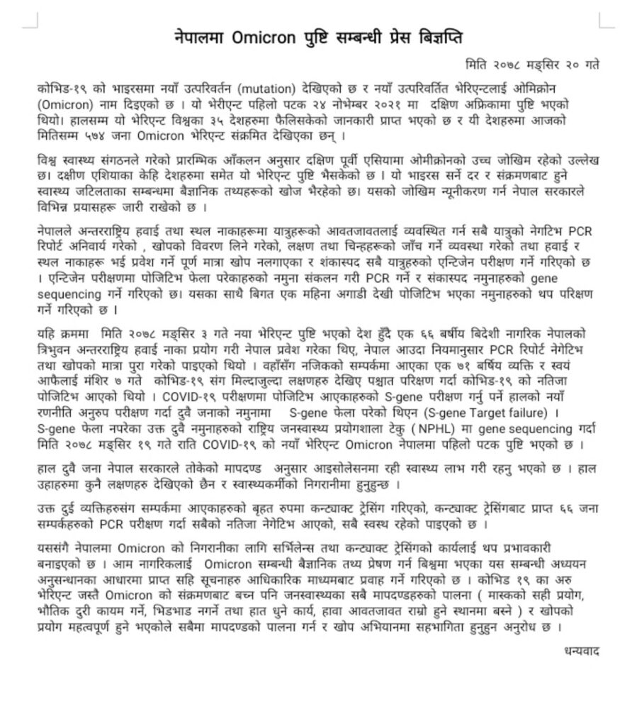 स्वास्थ्य तथा जनसंख्या मन्त्रालयले आज पत्रकार सम्मेलन गर्दै ओेमिक्रोन भेरियन्टको भाइरस पुष्टि भएको जनाएको छ।