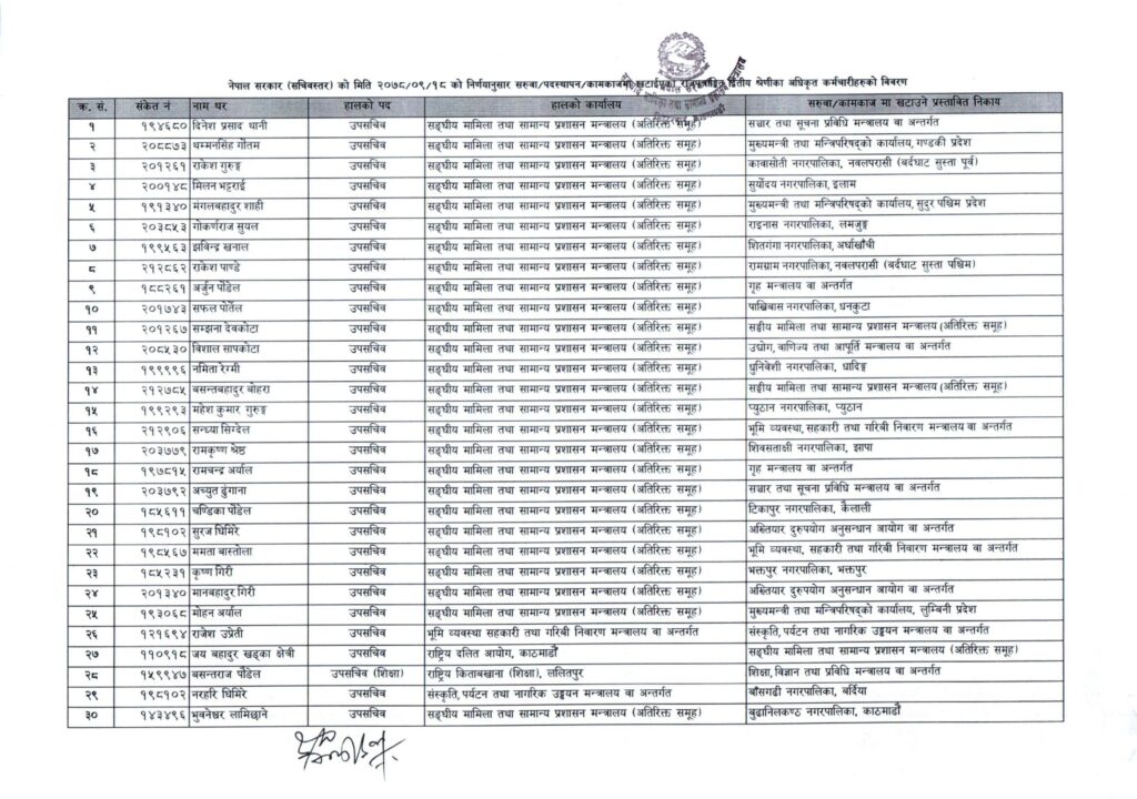 मन्त्रालयको विवरण अनुसार राजेश गुरुङलाई कावासोती नगरपालिका नवलपरासी(बर्दघाट सुस्ता पूर्व), मिलन भट्टराईलाई सूर्योदय नगरपालिका इलाम, मङ्गलबहादुर शाहीलाई मुख्यमन्त्री तथा मन्त्रिपरिषद्को कार्यालय, सङ्घीय मामिला तथा सामान्य प्रशासन मन्त्रालयको अतिरिक्त समूहमा रहेका दिनेश प्रसाद थानीलाई सञ्चार तथा सूचना प्रविधि मन्त्रालय वा अन्तर्गत, धम्मनसिँह गौतमलाई मुख्यमन्त्री तथा मन्त्रिपरिषद्को कार्यालय, गण्डकी प्रदेश, सुदूरपश्चिम प्रदेश, गोकर्णराज सुयललाई राईनाम नगरपालिका लमजुङ र झविन्द्र खनाललाई शितगंगा नगरपालिका अर्घाखाँची पठाइएको छ ।