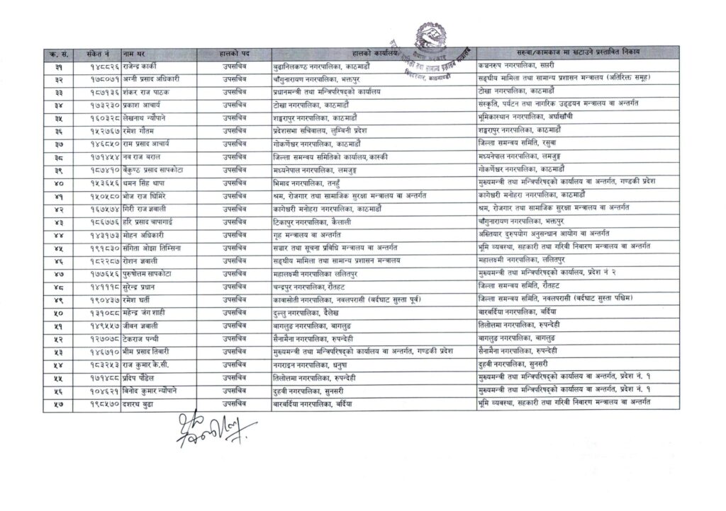 यसैगरी सम्झना देवकोटालाई सङ्घीय मामिला तथा सामान्य प्रशासन मन्त्रालयकै अतिरिक्त समूहमा, विशाल सापकोटालाई उद्योग, वाणिज्य तथा आपूर्ति मन्त्रालय वा अन्तर्गत, नमिता रेग्मीलाई धुनिवेशी नगरपालिका धादिङ र वसन्तबहादुर बोहरालाई सङ्घीय मामिला तथा सामान्य प्रशासन मन्त्रालय राकेश पाण्डेलाई रामग्राम नगरपालिका, नवलपरासी(बर्दाघाट सुस्ता पश्चिम), अर्जुन पौडेललाई गृह मन्त्रालय वा अन्तर्गत, राखिएको छ ।
