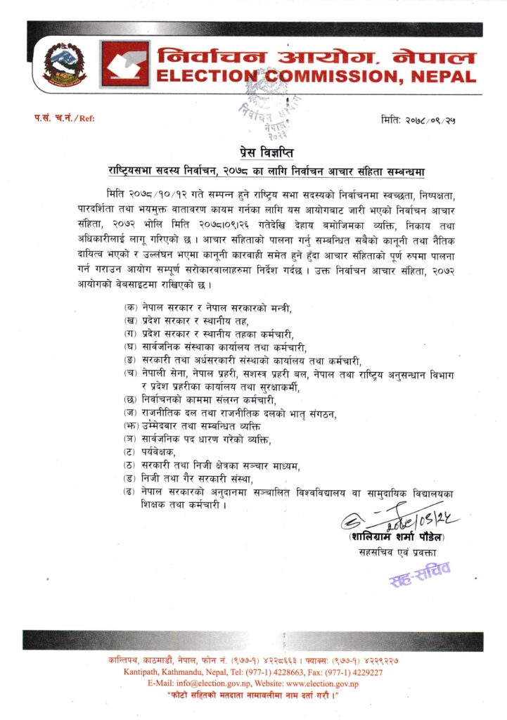 राष्ट्रियसभा निर्वाचनका लागि आचार संहिता लागु