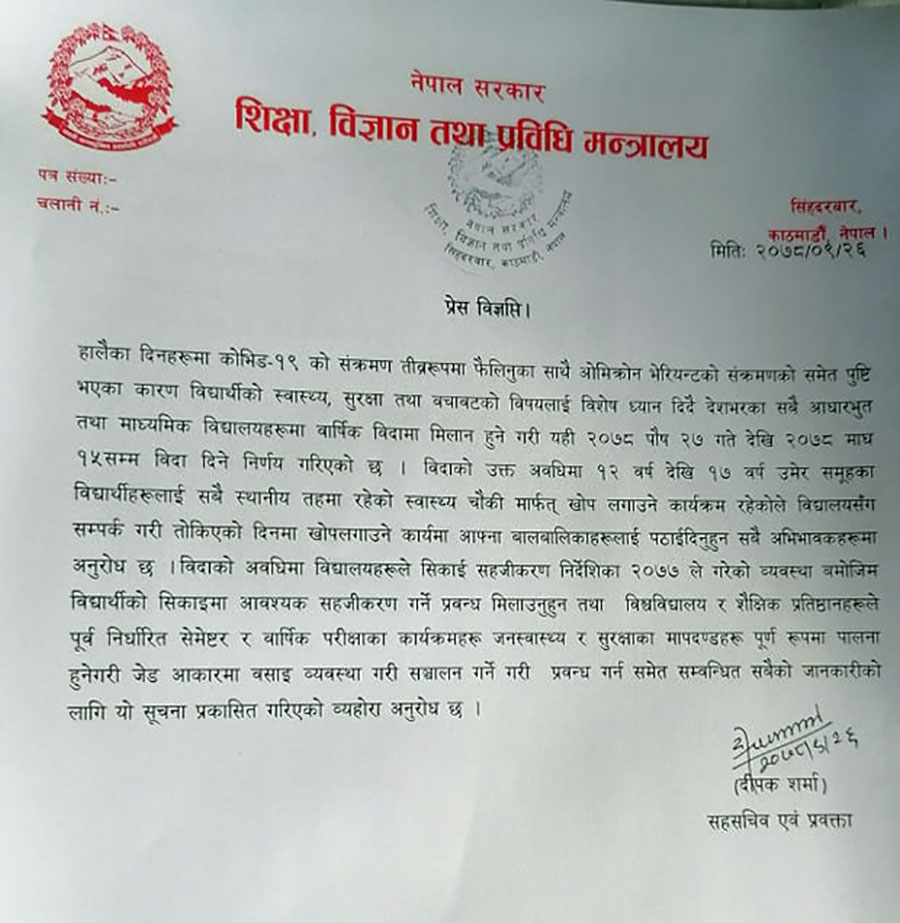 शिक्षा, विज्ञान तथा प्रविधि मन्त्रालयका प्रवक्ता दीपक शर्माले विज्ञप्ति जारी गरी पुस २७ देखि माघ १५ गतेसम्म विद्यालयहरु बन्द हुने जानकारी दिएका छन् ।