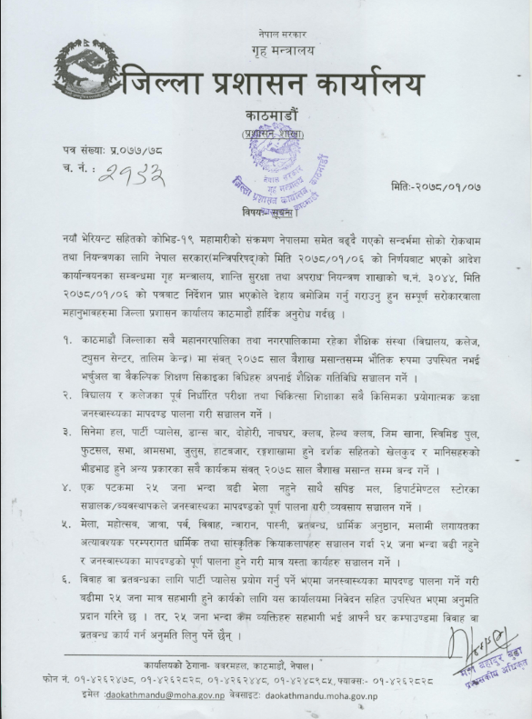 कोरोनाको रोकथाम, नियन्त्रण र उपचारलाई थप प्रभावकारी बनाउन कोभिड–१९ सङ्कट व्यवस्थापन केन्द्र (सिसिएमसी) को सिफारिस एवं गृहमन्त्रालयको निर्णय, सङ्क्रामक रोग नियन्त्रण ऐन, २०२० को दफा २ र स्थानीय प्रशासन ऐन, २०२८ को दफा ६ ले दिएको अधिकार प्रयोग गरी उक्त आदेश दिइएको प्रशासन कार्यालयद्वारा जारी सूचनामा उल्लेख छ । उक्त आदेश आज राति १२ बजेदेखि लागू हुनेछ ।