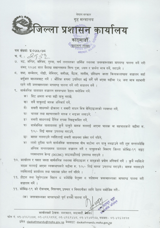 राजनीतिक, आर्थिक, सामाजिक, व्यावसायिक तथा अन्य गतिविधि गर्दा स्वास्थ्य सुरक्षा मापदण्डको पूर्ण पालना गर्न तथा सार्वजनिकस्थलमा सबै प्रकारका राजनीतिक तथा धेरै जना उपस्थित हुने गरी कार्यक्रम गर्न रोक लगाइएको छ ।