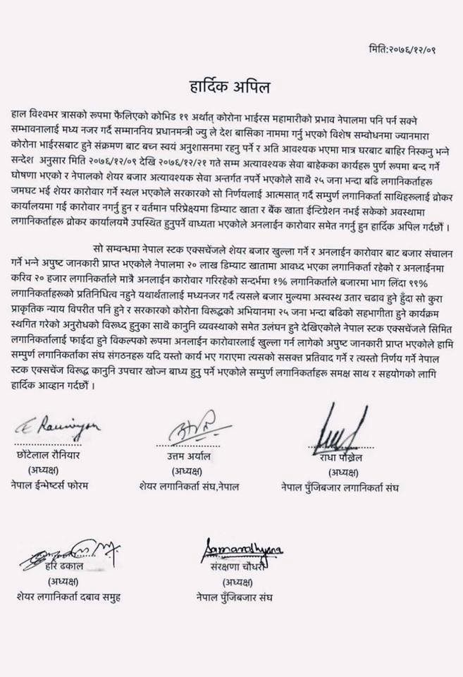 आइतबार नेपाल ईन्भेष्टर्स फोरम, शेयर लगानिकर्ता संघ नेपाल, नेपाल पुँजिबजार लगानिकर्ता संघ, शेयर लगानिकर्ता दबाव समुह र नेपाल पुँजिबजार संघले संयुक्त रुपमा विज्ञप्ती निकाल्दै शेयर कारोबार बन्द गरिएको सुुचना दिएका छन् ।