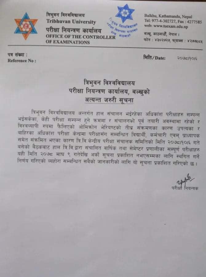 प्रधानमन्त्री एवं विश्वविद्यालयका कुलपति शेरबहादुर देउवाले कोभिड संक्रमण उच्च गतिमा फैलिरहेको अवस्थामा तत्काल परीक्षा लिने विषयमा पुर्नविचार गर्न त्रिवि उपकुलपतीलाई निर्देशन दिएका थिए ।