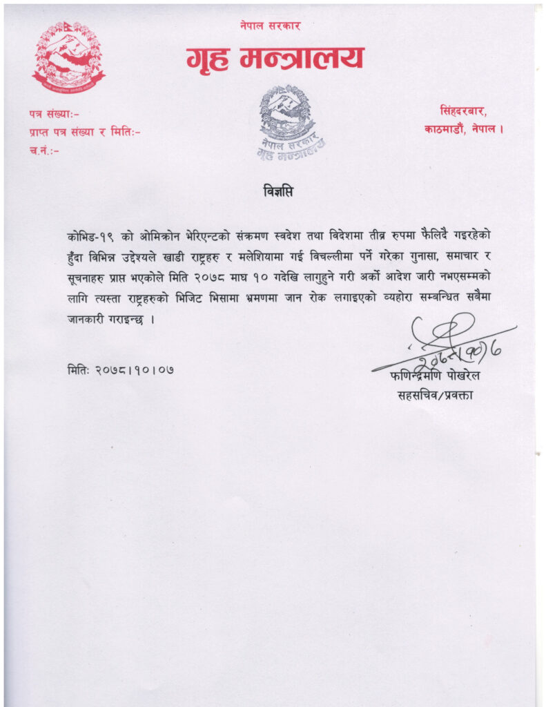 अर्को आदेश जारी नहुन्जेलसम्मको लागि माग १० गते देखि भिजिट भिसामा भ्रमणमा जान राेक लाग्ने गृह मन्त्रालयका सहसचिव एवं प्रवक्ता फणीन्द्रमणि पोखरेलले जानकारी दिएका छन् ।