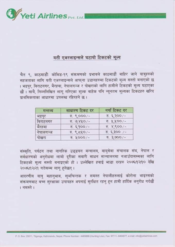 विश्वव्यापी फैलिएको कोरोनाको त्रासको कारण काठमाडौँ बाहिर जाने यात्रुहरुको सहजताका लागि यती एअरलाइन्सले आफ्नो टिकट दर घटाएको हो ।