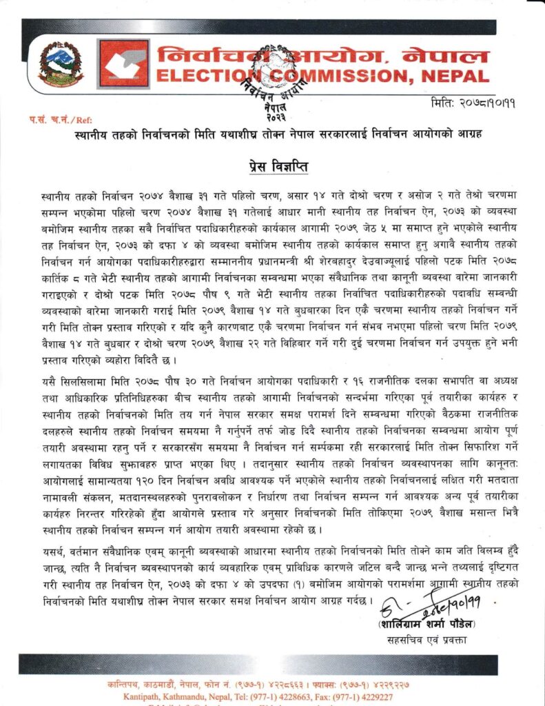 विज्ञप्ति मार्फत निर्वाचन आयोगले स्थानीय तहको निर्वाचन मिति यथाशीघ्र तोक्न सरकारलाई आग्रह गरेको छ ।