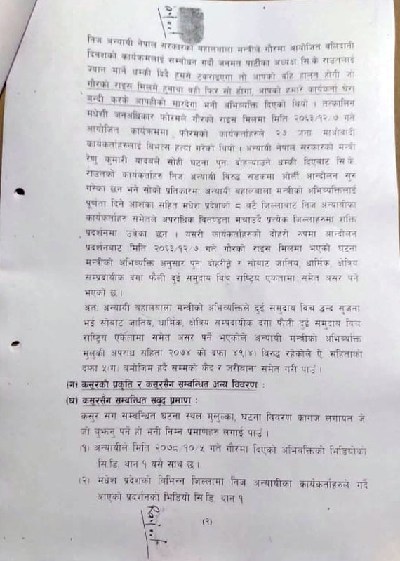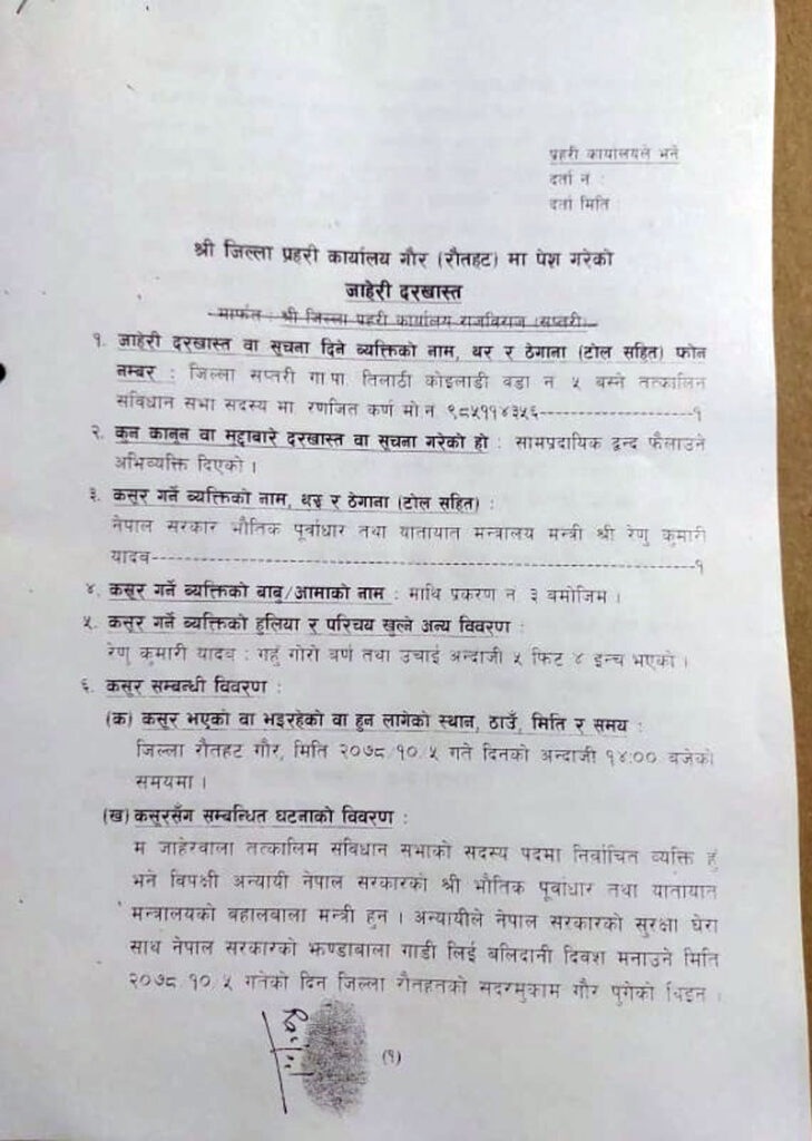 काठमाडौं-साम्प्रदायिक द्वन्द्व फैलाउने अभिव्यक्ति दिएको भनेर भौतिक पूर्वाधार तथा यातायातमन्त्री रेणुकुमारी यादवविरुद्ध प्रहरीमा जाहेरी दरखास्त परेको छ ।