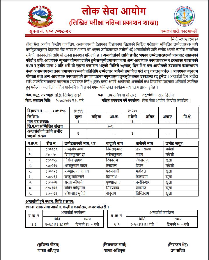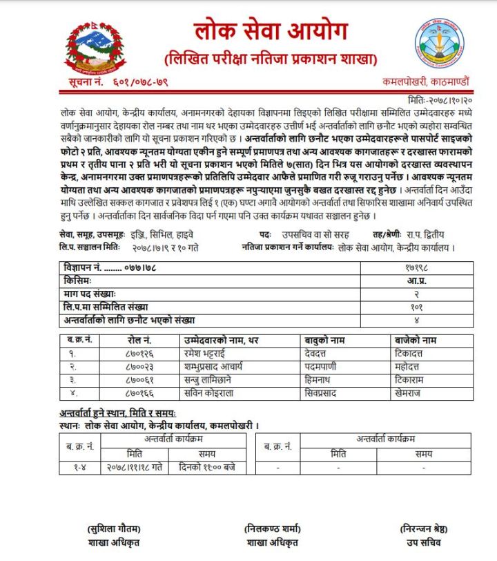 आयोगले बिहीबार २०७८ कार्तिक ९ र १० गते लिइएको आन्तरिक र खुल्लातर्फको लिखित परीक्षाको नतिजा सार्वजनिक गरेको हो ।