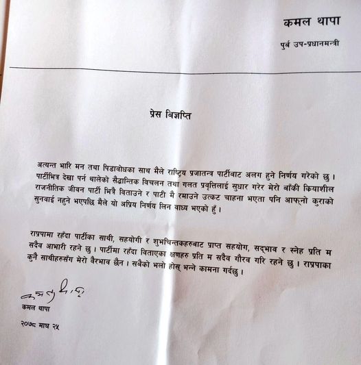 काठमाडौं-कमल थापाले पार्टी परित्यागको घोषणा गरेका छन्।