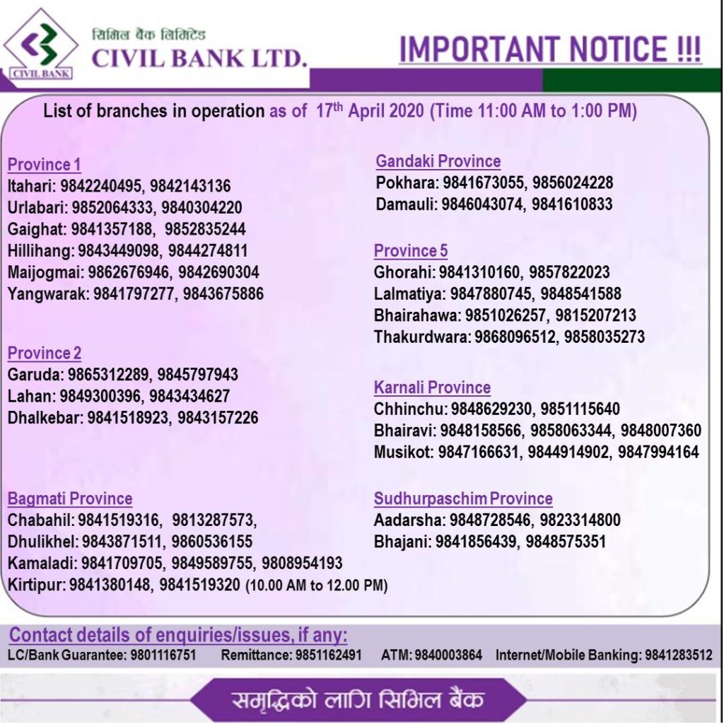 सरकारकाे याे लकडाउनकाे आग्रहलाई पुर्ण पालना गर्दै अत्यावश्यक सेवा अन्तर्गतको बैंकिङ सेवालाई सिभिल बैंकले निरन्तरता दिदै आएकाे छ ।