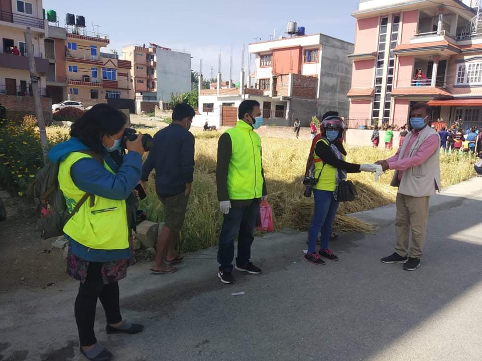 कोरोनाको त्रास बीचमा पनि जाेखिम माेलेर दिनरात नभनी समाचार सम्प्रेषण गर्ने सन्चारकर्मिहरुलाई सुरक्षित तवरबाट समचार सम्प्रेषण गर्न सहयाेग पुगाेस् भन्ने उद्देश्यले सुर्य नगर टोल बिकास समाजले आज भक्तपुरका पत्रकारलाई सिनिटाइजर, मास्क र ग्लोबस प्रदान गरेको हाे ।