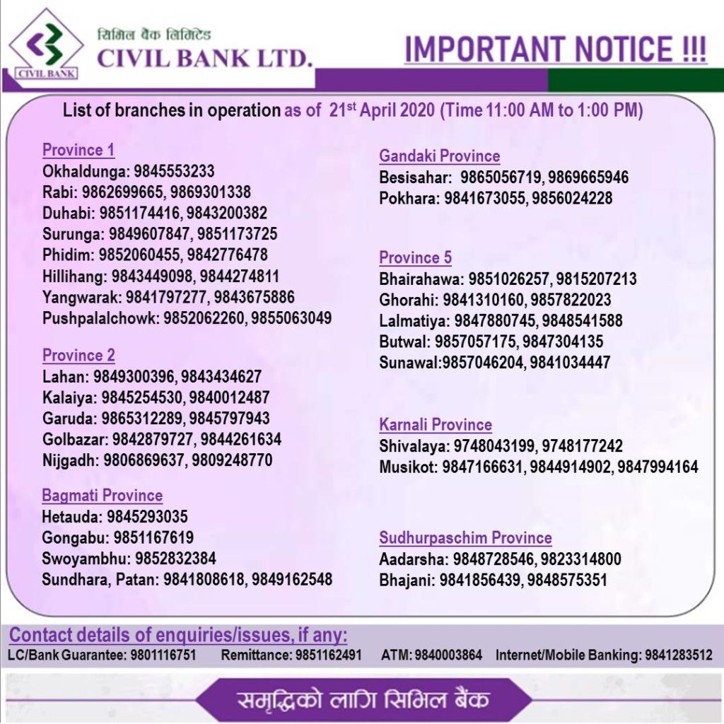 सरकारकाे याे लकडाउनकाे अाग्रहलाई पुर्ण पालना गर्दै अत्यावश्यक सेवा अन्तर्गतको बैंकिङ सेवालाई सिभिल बैंकले निरन्तरता दिदै आएकाे छ ।