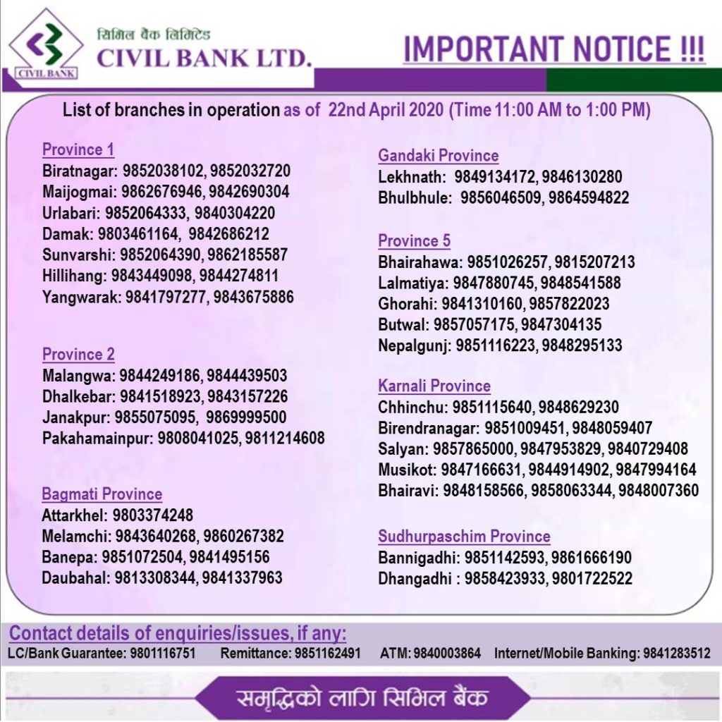 सरकारकाे याे लकडाउनकाे आग्रहलाई पुर्ण पालना गर्दै अत्यावश्यक सेवा अन्तर्गतको बैंकिङ सेवालाई सिभिल बैंकले निरन्तरता दिदै आएकाे छ ।