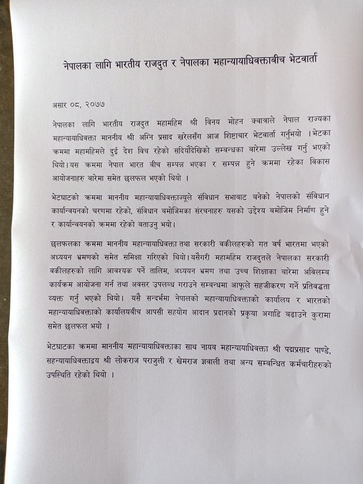 काठमाडौं । नेपालका लागि भारतीय राजदूत विनय मोहन क्वात्राले महान्यायाधिवक्ता अग्निप्रसाद खरेलसँग भेटवार्ता गर्नुभएको छ । सोमबार आज भएको भेटमा दुई देशबीच सदियौंदेखि रहेको सम्बन्धका बारेमा चर्चा भएको थियो ।