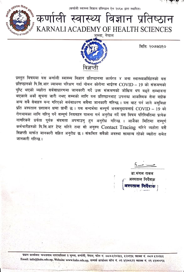 काठमाडौँ । कर्णाली स्वास्थ्य विज्ञान प्रतिष्ठान जुम्लाले अत्यावस्यक बाहेक सबै सेवाहरु बन्द गर्ने भएको छ । प्रतिष्ठानका ४ जना स्वास्थ्यकर्मीमा कोरोना भाइरस संक्रमण देखिएपछि अत्यावश्यकबाहेक सबै सेवा बन्द गरिएको प्रतिष्ठानले जनाएको छ ।