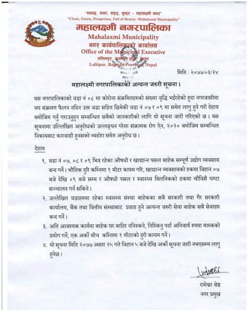 ललितपुर । महालक्ष्मी नगरपालिकाले अत्यावश्यकबाहेक सम्पूर्ण सेवा बन्द गरेको छ। नगरभित्रका केही ठाउँमा कोरोनाको संक्रमण बढेकाले जोखिम नियन्त्रण गर्न यस्तो निर्णय गरेको नगरपालिकाले अत्यावश्यक बाहेकका सम्पुर्ण सेवा बन्द गरेको हो ।