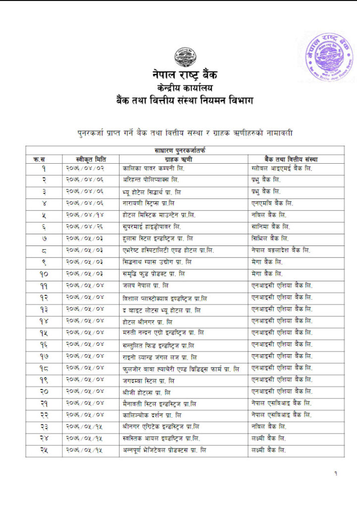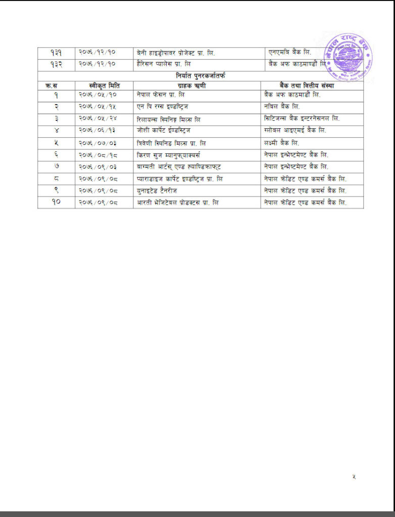 काठमाडौंः केन्द्रीय बैंकले १ सय ४२ ऋणीलाई पुनर्कर्जा दिने निर्णय गरेको छ। नेपाल राष्ट्र बैंक पुनर्कर्जा कार्यविधि २०७६ बमोजिम आर्थिक वर्ष २०७६–७७ मा साधारण तथा निर्यात पुनर्कर्जा प्राप्त गर्ने ऋणी संस्था तथा बैंकको नाम सार्वजनिक गरेको हो। जसमध्ये साधारण पुनर्कजातर्फ १ सय ३२ ऋणी र निर्यात पुनर्कर्जा व्यवसायतर्फका १० ऋणीले ऋण प्राप्त गर्ने छन्।