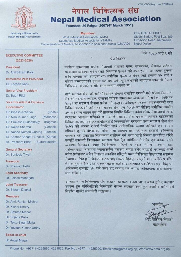 डाक्टरलाई सरकारी सेवामा प्रवेश गर्न ४५ वर्षको उमेर हद कायम गर्न चिकित्सक संघको माग