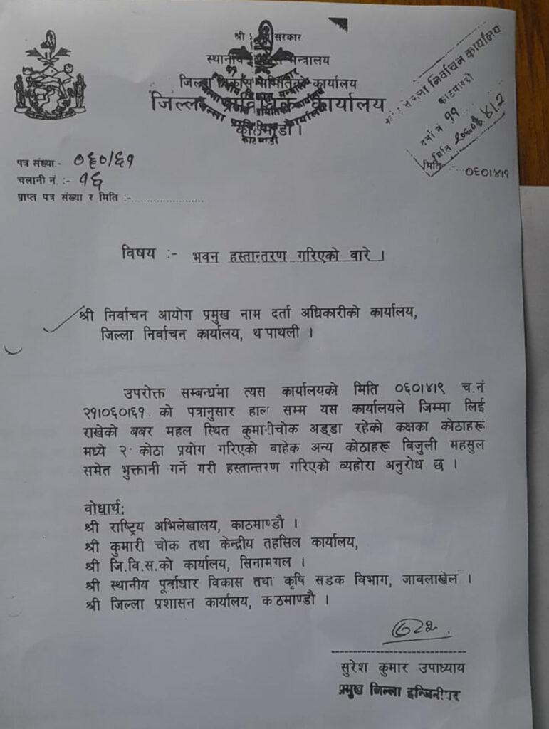 जिल्ला निर्वाचन अधिकारी ठाकुरप्रसाद भट्टराईका अनुसार २०६० साल साउन ९ गते तत्कालीन जिल्ला प्राविधिक कार्यालय, काठमाडौंले बबरमहलस्थित कुमारी चोक अड्डा रहेको कक्षका कोठाहरुमध्ये २ वटाबाहेकका अरु कोठाहरु जिल्ला निर्वाचन कार्यालयलाई हस्तान्तरण गरेको थियो । त्यसअघि ती कोठाहरु जिल्ला प्राविधिक कार्यालयले नै प्रयोग गरेको थियो ।