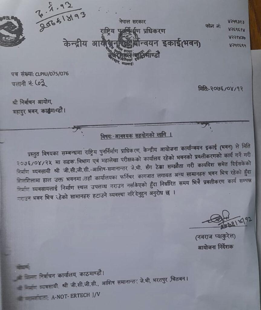 तर, अहिले छिर्न नै नदिने अवस्था आएको भन्दै निर्वाचन कार्यालयले विघटित राष्ट्रिय पुनर्निर्माण प्राधिकरणको जिम्मेवारी लिएर बसेको शहरी विकास तथा भवन निर्माण विभागलाई पत्र लेखेको छ । कार्यालयले प्रवलीकरण सकिएका कारण साविकको कक्षहरुमा आफ्नो कार्यालय सर्ने तयारी गरेकाले हस्तान्तरण गर्न आग्रह गरेको छ ।