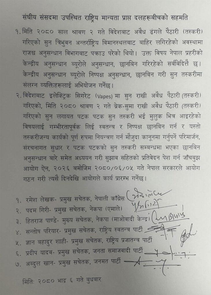 २ साउनमा ब्रेक सुमा लुकाएर ल्याएको ६० किलो भन्दा बढी सुन तस्करीबारे नेपाल प्रहरीको केन्द्रीय अनुसन्धान ब्यूरो ९सीआईबी०ले अनुसन्धान सकेपछि आयोग बन्नेछ । बुधबार सिंहदरबारमा दलहरुबीच भएको सहमतिमा अर्को महिना असोज ५ गते सरकारले आयोग बनाउने र त्यही दिनदेखि आयोगले काम प्रारम्भ गर्ने उल्लेख छ ।