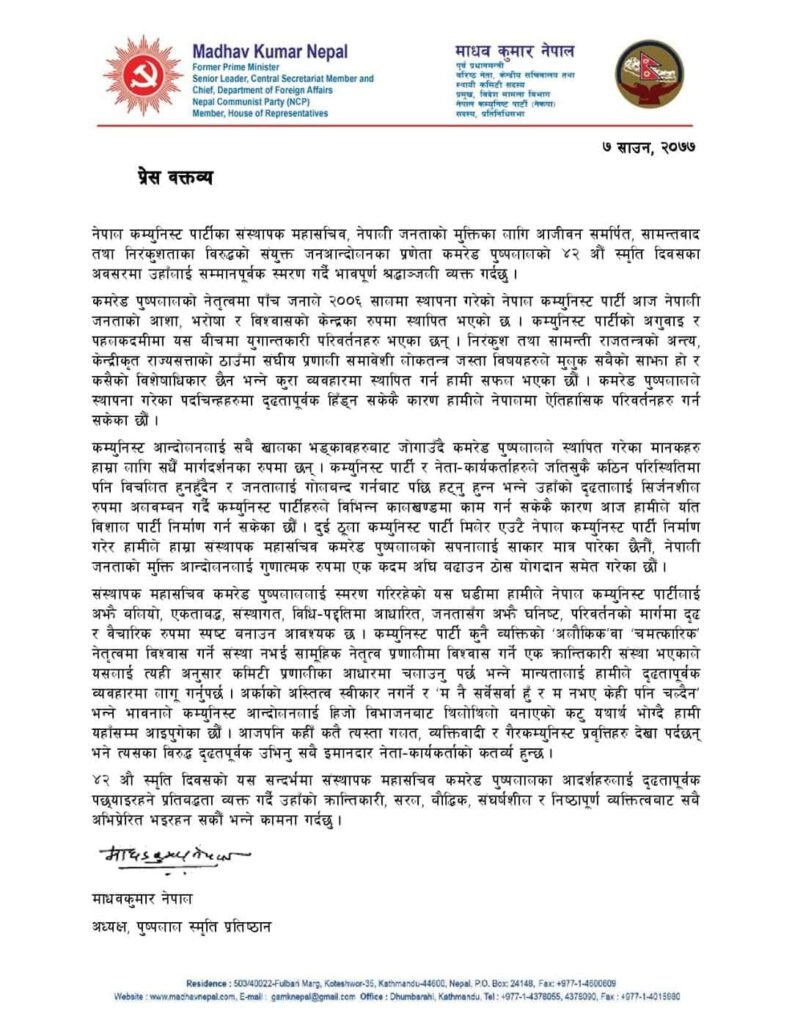 नेपाल कम्युनिष्ट पार्टीका संस्थापक महासचिव पुष्पलालको ४२ औं स्मृति दिवसका अवसरमा नेता नेपालले एक विज्ञप्ति जारी गर्दै यस्तो बताउनुभएको हो।