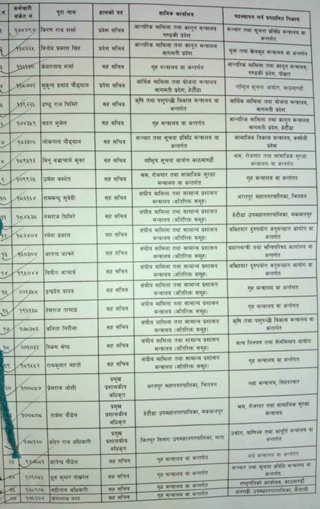 भरतपुर महानगरपालिका, चितवनका सहसचिव प्रेमराज जोशी रक्षा मन्त्रालय, हेटौडा उपमहानगरपालिका, मकवानपुरका सहसविचव राजेश पौडेल श्रम रोजगार तथा सामाजिक सुरक्षा मन्त्रालय, जितपुर सिमरा उपमहानगरपालिका, बाराका सहसचिव प्रदीप राज अधिकारी उद्योग वाणिज्य तथा आपूर्ति मन्त्रालय सरुवा गरिएको छ।