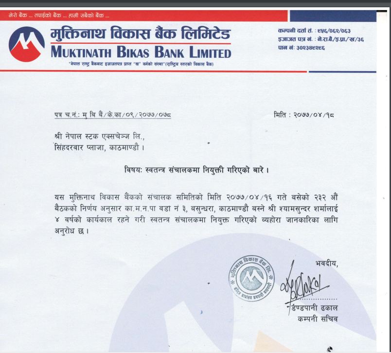 काठमाडौँ । मुक्तिनाथ विकास बैंक लिमिटेडको स्वतन्त्र संचालकमा श्यामसुन्दर शर्मा नियुक्त भएका छन्।