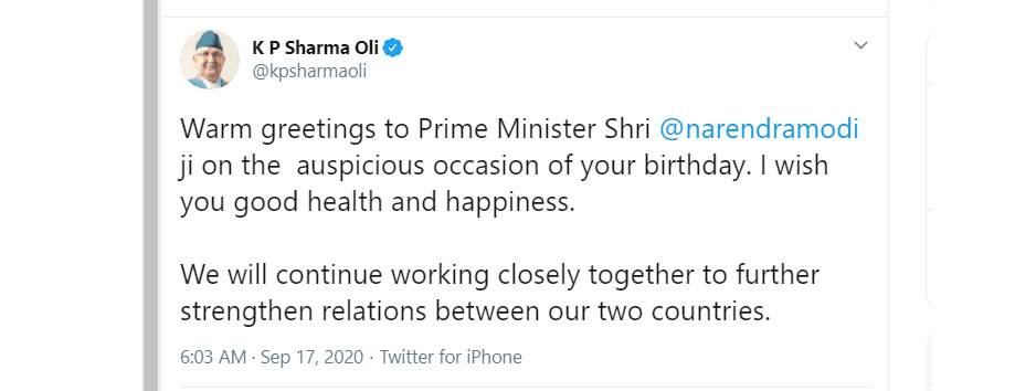 ‘तपाईँको जन्मदिनको शुभ अवसरमा सु–स्वास्थ्य र खुसीको कामना गर्दछु’, प्रधानमन्त्रीले ओलीले भनेका छन्, ‘हामी दुई देशबीचको सम्बन्धलाई अझ प्रगाढ बनाउन निरन्तर लाग्नेछौँ।’