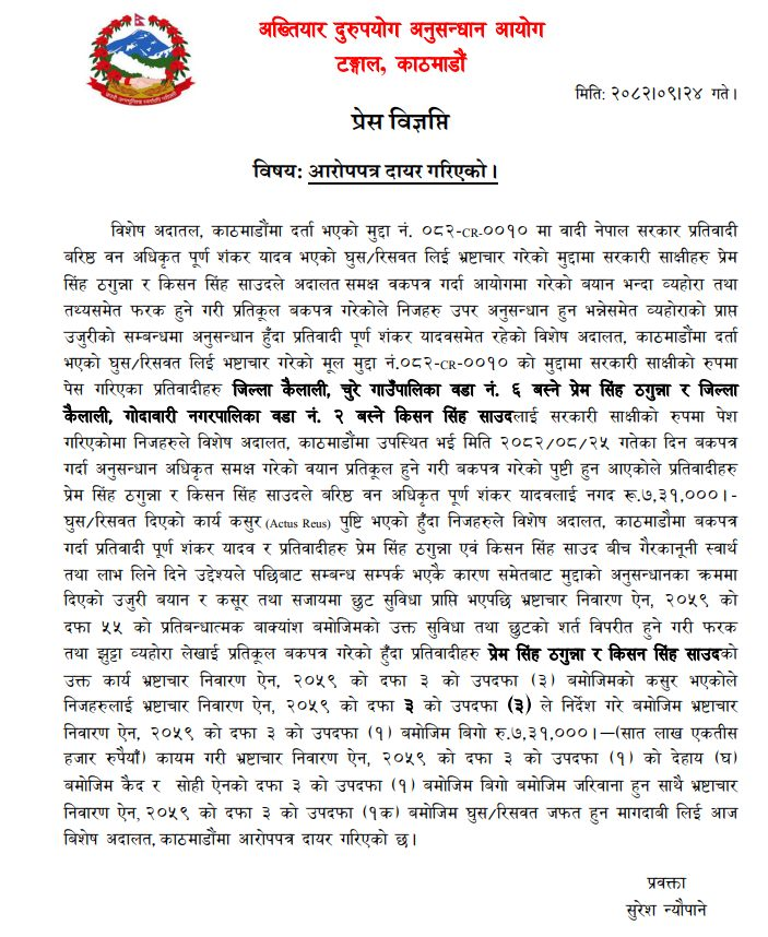 अकाठमाडौँ । अख्तियार दुरुपयोग अनुसन्धान आयोगले कैलाली चुरे गाउँपालिका वडा नं. ६ बस्ने प्रेम सिंह ठगुन्ना र गोदावरी नगरपालिका वडा नं. २ बस्ने किसन सिंह साउदविरुद्ध भ्रष्टाचार मुद्दा दायर गरेको छ ।