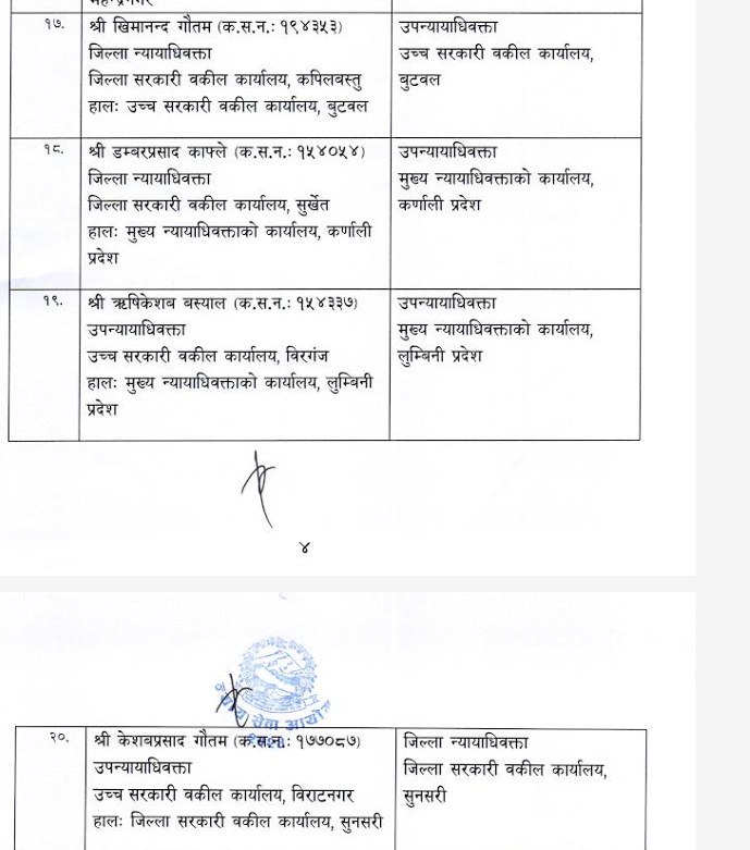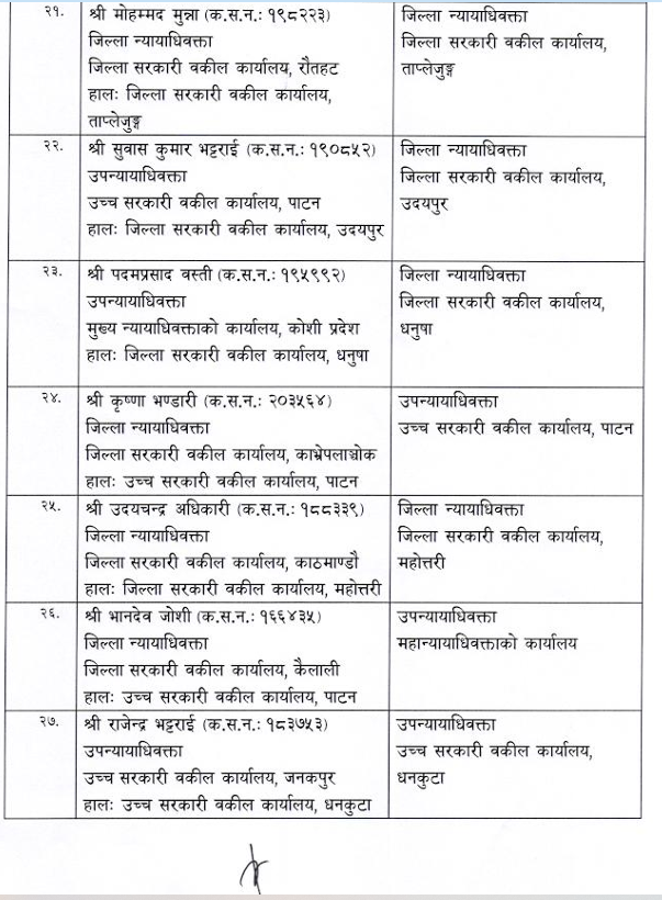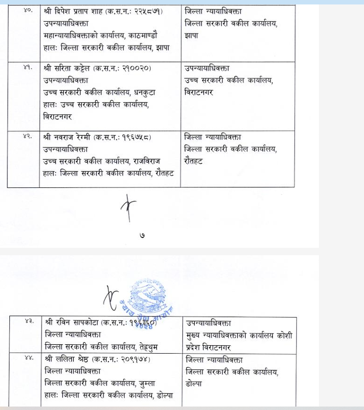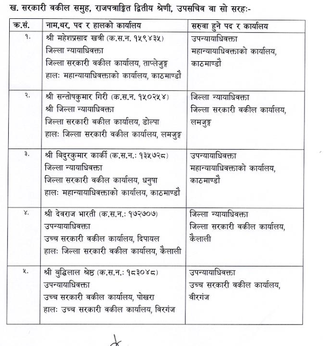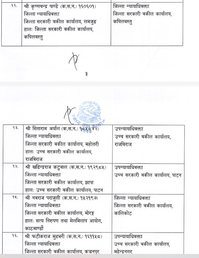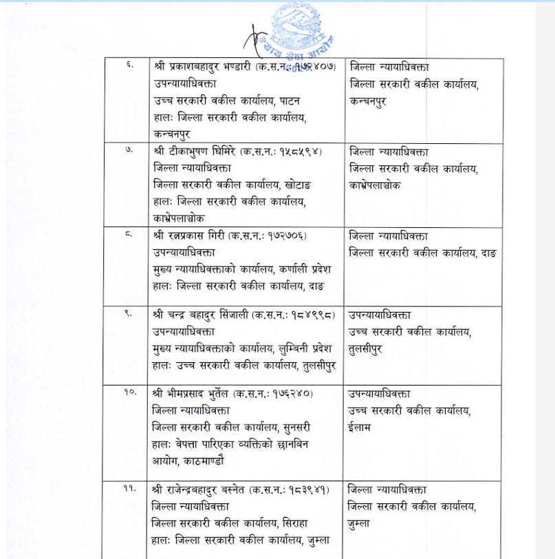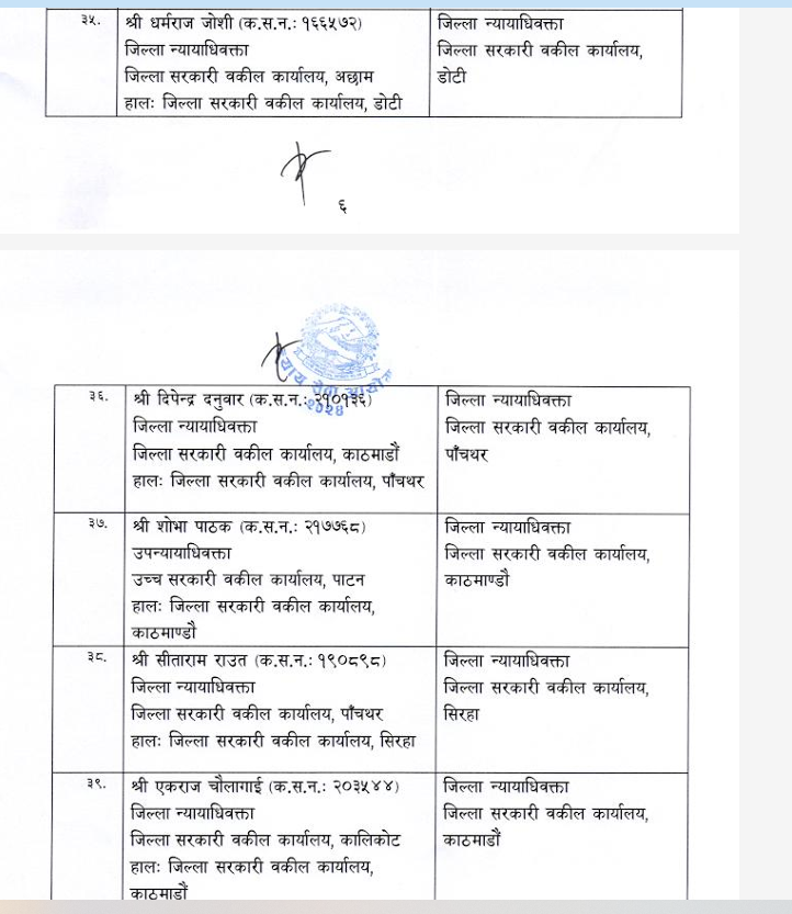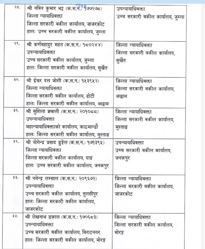 शुक्रबार न्याय सेवा आयोगले सरकारी वकिल समूह, राजपत्राङ्कित द्वितीय श्रेणी, उपसचिव वा सो सरहका ४४ कर्मचारीको सरुवा गरेको हो ।