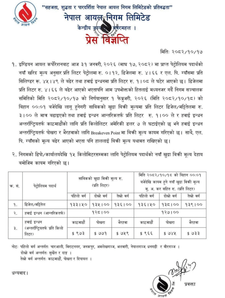 भारतीय आयल कर्पोरेसनबाट प्राप्त नयाँ मूल्य सूचीअनुसार आयात मूल्य बढेपछि डिजेल र मट्टितेलको भाउ समायोजन गर्नुपरेको निगमको भनाइ छ। यद्यपि पेट्रोल र खाना पकाउने एलपी ग्यासको खुद्रा मूल्यमा भने हाल कुनै परिवर्तन गरिएको छैन।