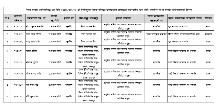 यसैगरी इन्जिनियरिङ सेवातर्फका सहसचिवहरू प्रकाश चौधरी, ओमराज ढुंगाना, मनिष कुमार अर्याल, राम कुमार श्रेष्ठ र गौरी कुमार श्रेष्ठलाई शहरी विकास मन्त्रालय तथा मातहतका निकायमा खटाइएको छ ।