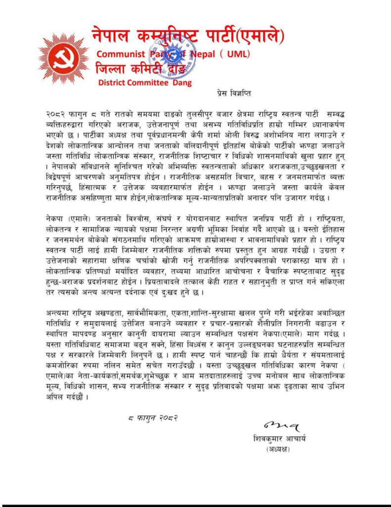 एमाले दाङ जिल्ला अध्यक्ष शिवकुमार आचार्यले जारी गरेको विज्ञप्तिमा राष्ट्रिय स्वतन्त्र पार्टीलाई जिम्मेवार राजनीतिक शक्ति बन्न आग्रह गर्दै भनेका छन् कि उग्रता र उत्तेजनाको सहाराले मात्र सानो चर्चा पाउन सकिएला तर यो राजनीतिक अपरिपक्वताको स्पष्ट उदाहरण हो।