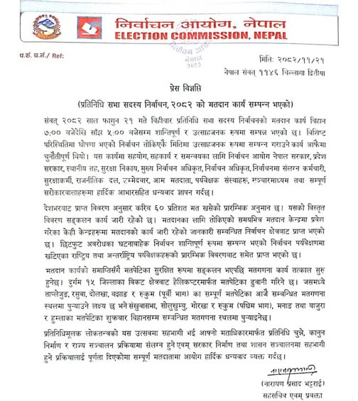 आयोगले मतदान समग्रमा शान्तिपूर्ण वातावरणमा सम्पन्न भएको जनाएको छ।
