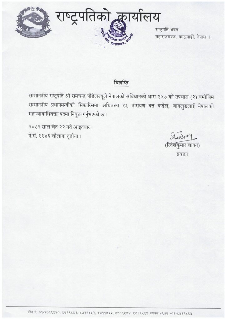 काठमाडौं । सरकारले महान्यायाधिवक्तामा डा. नारायणदत्त कँडेललाई नियुक्त गरेको छ । सिंहदरबारस्थित प्रधानमन्त्री तथा मन्त्रिपरिषद् कार्यालयमा आइतबार बसेकाे मन्त्रिपरिषद बैठकले यस्ताे निर्णय गरेकाे हाे ।