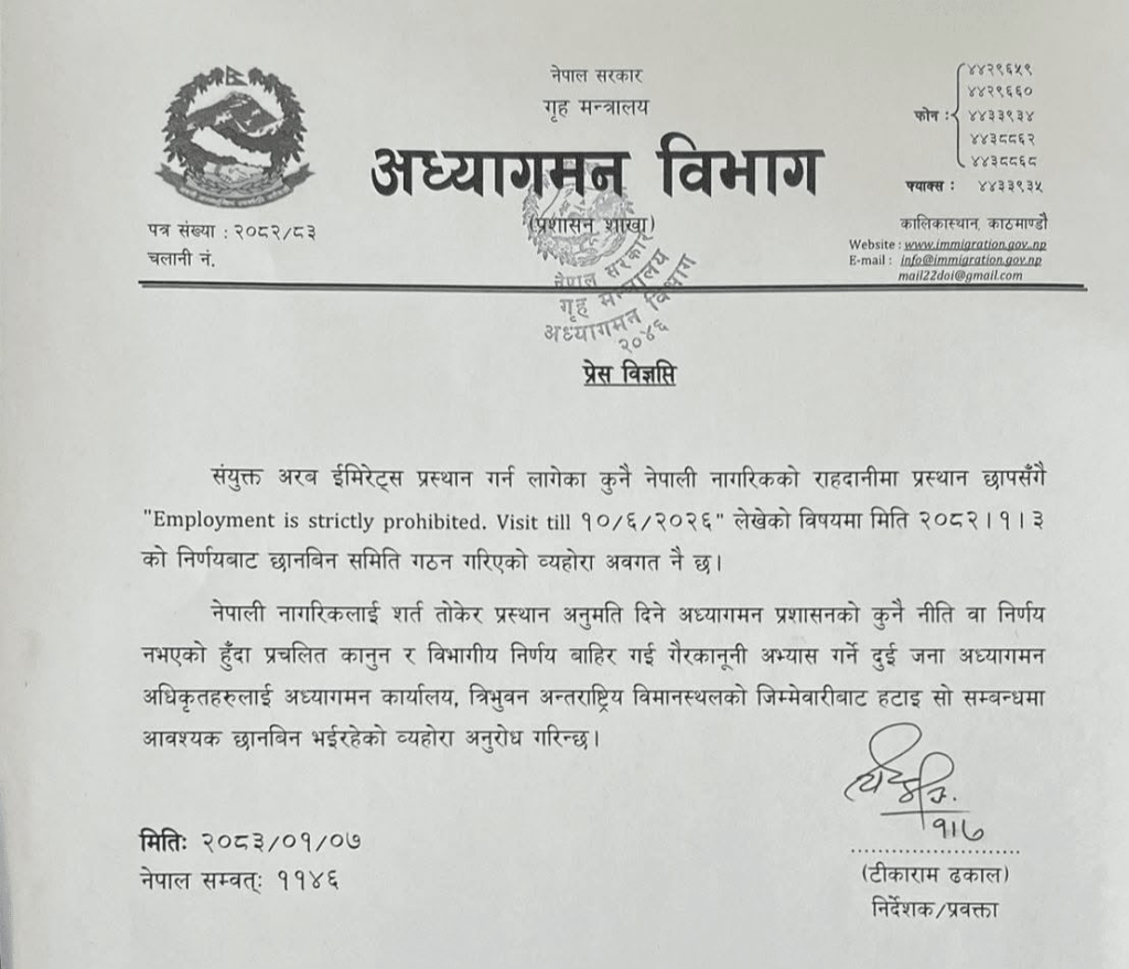 अध्यागमन विभागका प्रवक्ता टीकाराम ढकालले जारी गरेको विज्ञप्तिमा नेपाली नागरिकलाई शर्तसहित विदेश प्रस्थान अनुमति दिने कुनै नीतिगत व्यवस्था नरहेको स्पष्ट पारिएको छ। नीति विपरीत व्यक्तिगत तहमा गरिएको यस्तो कार्यलाई गम्भीर रूपमा लिँदै थप अनुसन्धान प्रक्रिया अघि बढाइएको जनाइएको छ।