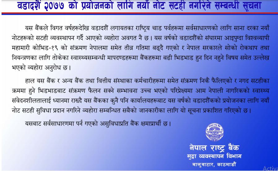कोरोना भाइरस संक्रमणको जोखिमका कारण दशैं लक्षित नयाँ नोट सटही नगर्ने राष्ट्र बैंककले सूचनामार्फत जानकारी दिएको छ । विगतका वर्षहरुमा दशैंमा नयाँ नोट सटही हुँदै आएपनि यसपालिको दशैंमा भने कोरोना भाइरसको संक्रमणको जोखिमलाई ध्यानमा राखेर नयाँ नोट सटही नगरेको बैकले जनाएको छ । ‘हाल बैंक तथा वित्तीय संस्थाका कर्मचारीमा समेत कोरोना संक्रमण निकै फैलिएको र नगद सटहीका क्रममा हुने भिडभाडबाट संक्रमण फैलन सक्ने सम्भावना उच्च भएको भएको परिपेक्ष्यमा आम नेपाली नागरिकको स्वास्थ्य संवेदनशीलतालाई ध्यानमा राख्दै यस बैंकका कुनैपनि कार्यालयहरुबाट यस वर्षको वडादशैंको प्रयोजनका लागि नयाँ नोट सटही सुविधा प्रदान नगरिने व्यहोरा सम्बन्धित सबैको जानकारीका लागि यो सुचना प्रकाशित गरिएको छ,’ सूचानामा भनिएको छ ।