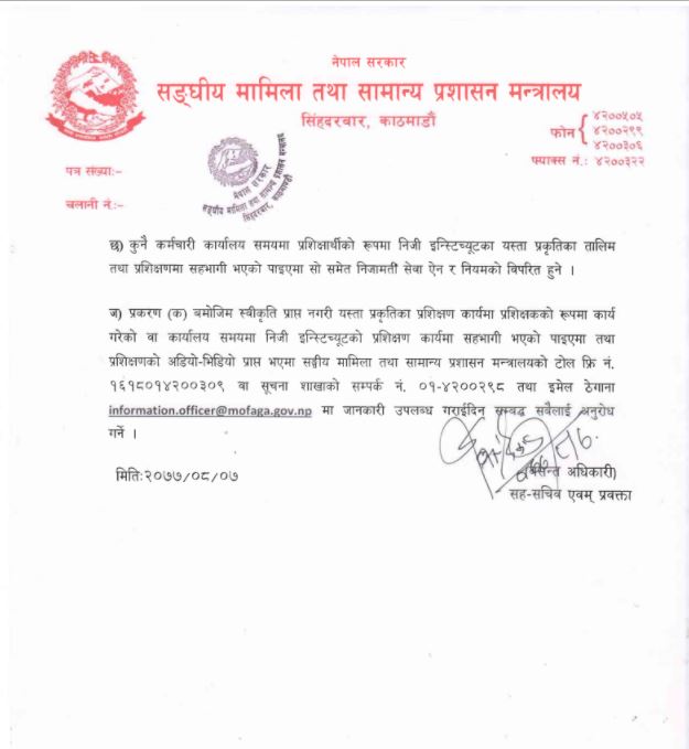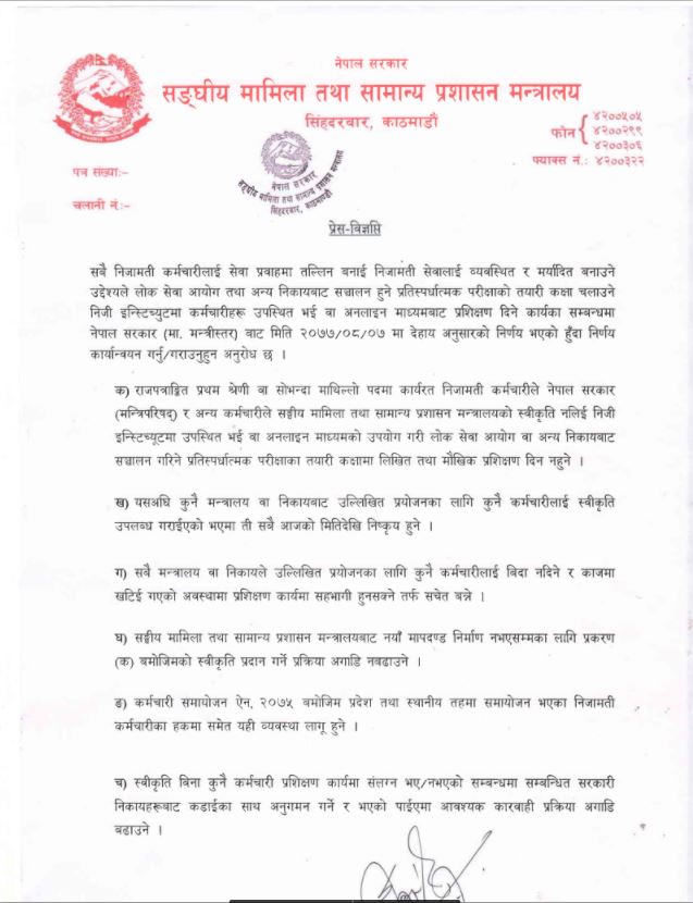 काठमाडौँ । काठमाडौ ।संघीय मामिला तथा सामान्य प्रशासन मन्त्रालयले पछिल्लो समय प्रशासन सुधारका नयाँ नयाँ फर्मुला ल्याउन सफल भएको छ। सरुवा बढुवाका लागी मन्त्रालय मै धाउनुपर्ने बिगतका परम्परागत ढाचा अब फेरिएको मात्र छैन पुरा पुर अनलाइन प्रणाली लागू हुने भएको छ।मन्त्रालयमा आज बसेको मन्त्री स्तरीय निर्णयबाट कुनै पनि कर्मचारीले निजि ईन्स्टिच्युटमा गएर वा भिडियो लाइभमा पढाउन नपाइने निति ल्याइएको छ।अफिसमा काम गर्दा आफ्नो राष्ट्र प्रति को जिम्मेवारीलाई पुरा गर्न सबै कर्मचारीलाई निर्देशन समेत दिएको छ।यो निर्णयले आम जनमानसमा सुशासनको आशा जगाएको छ भने काम चोर कर्मचारीलाई जिम्मेवारी बोध गराएको छ।यसैबीच मन्त्रालयमा सचिब एकनारायण अर्याल आएपछि सुधारका खाका अगाडि बढेका छन।