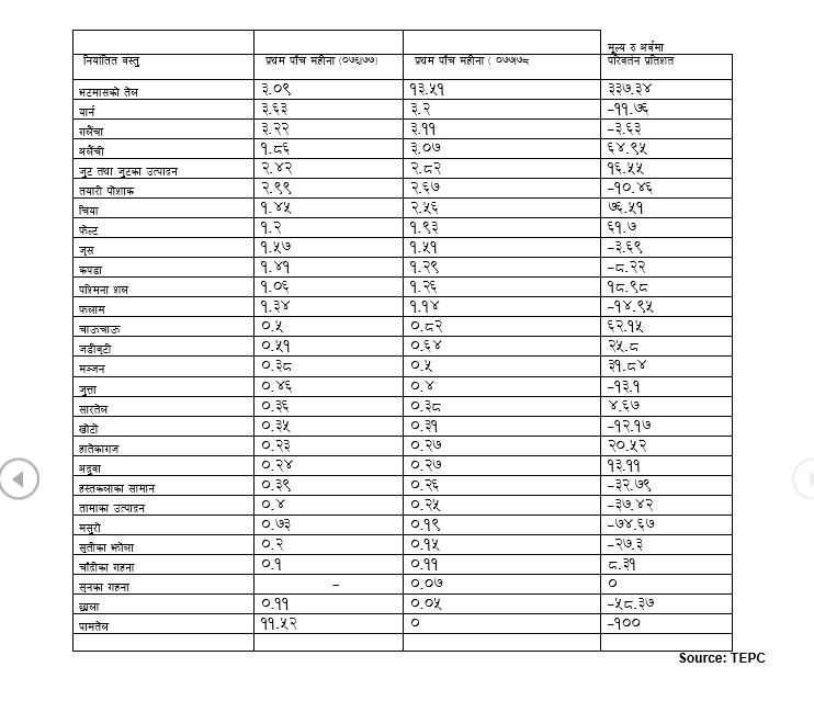 तर अघिल्ला वर्षको वार्षिक विवरण भने राम्रो नै थियो । देशको आयात तथा निर्यातको अवस्था निकासी बढेको थियो भने आयातमा गिरावट आएाके थियो । आ. व.२०७५–०७६ मा ९७ अर्ब १० करोड ८८ लाख १३ हजार बराबरको निकासी भएको थियो भने ०७६।७७ मा भने ९७ अर्ब ७० करोड ९१ लाख ५ हजार निकासी भएको हो । त्यस्तै ०७५।७६ मा आयात कुल रु. १४ खर्ब १८ अर्ब ५५ करोड ९४ लाख ३१ हजारको भएको थियो भने ०७६।७७ मा ११ खर्ब ९६ अरव ७९ करोड ९० लाख ५३ हजारको आयात भएको थियो ।